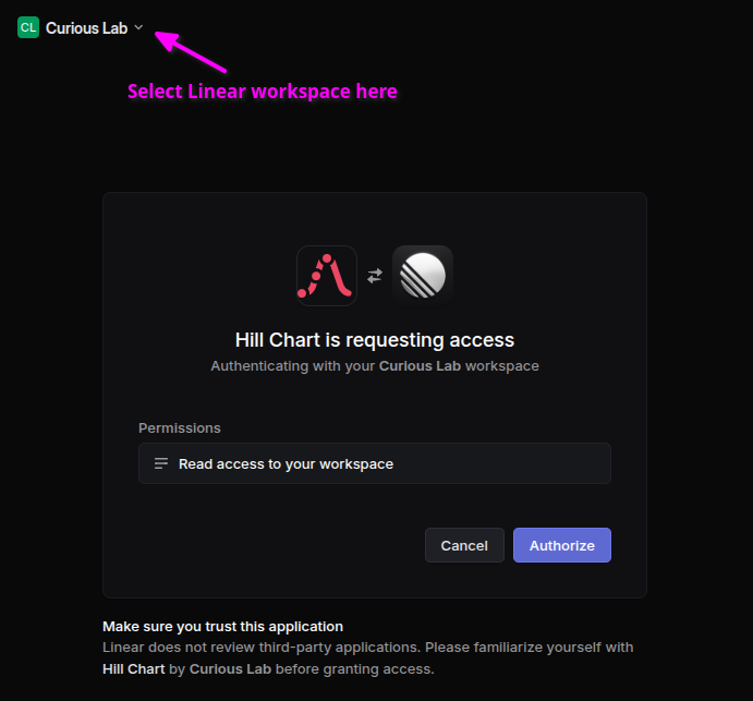 Then, grant the Hill Chart app read access to your Linear workspace. If you have multiple workspaces on Linear, make sure you choose the right one (use the selector on the top left corner of your page).